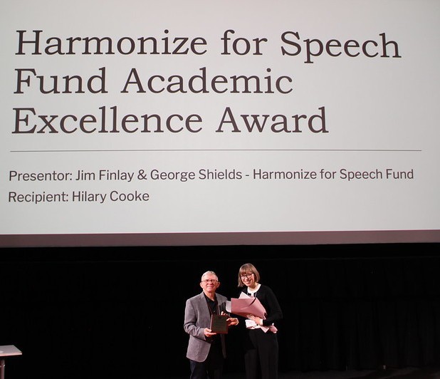 Co-chairs of Harmonize for Speech (H4S), George Shields and Jim Finlay along with Earle Goodwin and Greg Shields, members of East York Barbershoppers Chapter of the Ontario District of the Barbershop Harmony Society International (BHS) attended the University of Toronto Speech/Language Pathology Alumni Association Convocation Reception on October 28th. They provided information about the activities of the Ontario District of the Society and about the official charity of the District, H4S. Jim and George presented the H4S Academic Achievement Award (a plaque and $1000.00) To Hilary Cooke. The four barbershoppers then entertained the audience with the District’s two unofficial theme songs, “We Sing that They Shall Speak” and “Keep the Whole World Singing”. This is an annual event, and the Board of Trustees of H4S look forward to presenting it again next year.